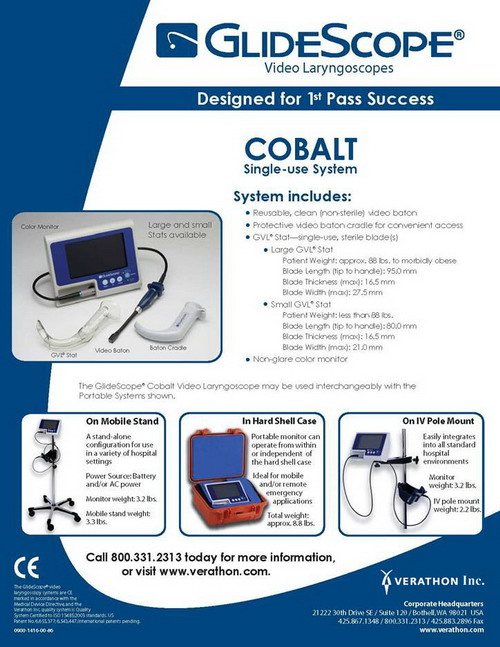 Optimized for demanding OR, ED and ICU applications., the GlideScope® Cobalt provides a clear view, enabling quick intubation in unpredictable airway conditions. The combination of a single-use, sterile Cobalt GVL® Stat and GlideScope® video baton is ideal for fast-paced intubation settings. No waiting for disinfection. Cobalt provides a real-time view of the airway and tube placement features :- Reusable Video Baton houses integrated high resolution camera; patented anti-fogging mechanism resists lens contamination